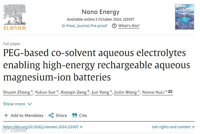 S. Zhang, Y. Sun, X. Zeng, J. Yang, J. Wang, Y. NuLi, PEG-based co-solvent aqueous electrolytes enabling high-energy rechargeable aqueous magnesium-ion batteries, Nano Energy, (2024) 110307.