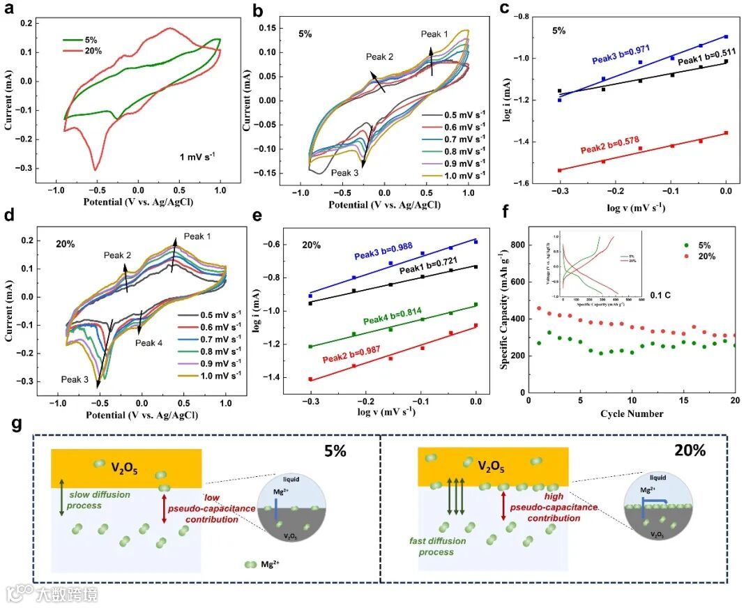 图4a展示了使用V2O5电极在含有5%和20%水的电解液中的循环伏安曲线。结果表明,在20%水含量的电解液中,V2O5电极的氧化还原峰更明显,电流响应更高,这表明水含量增加有助于改善镁离子在V2O5中的扩散性能,从而提高电极的反应动力学。图4b-e分别展示了5%和20%水含量电解液中,不同扫描速率下的CV曲线。20%水含量的电解液表现出更大的CV曲线包络面积,表明在更高水含量下,V2O5电极的比容量更高。根据log(i)对log(v)(电流与扫描速率的关系)作图,提取出b值。b值为0.5表明该过程是扩散控制,b值为1表示电容控制。结果显示,在5%水含量的电解液中,电极反应主要由扩散控制,而在20%水含量下,更多的氧化还原反应表现出电容控制行为,特别是高电位处的氧化还原峰(峰2和峰3),显示出高赝电容的行为。图4f显示了V2O5电极在5%和20%水含量电解液中的循环性能对比。结果表明,含有20%水的电解液能够实现更高的比容量(约400 mAh/g),而且在0.1 C倍率下的放电容量显著高于5%水含量电解液。这进一步证明,较高的水含量有助于提高V2O5电极的容量和赝电容贡献。图4g通过示意图展示了在5%和20%水含量电解液中,V2O5电极材料的离子扩散控制过程和赝电容贡献。20%水含量电解液中,镁离子扩散更快,赝电容贡献更大,表现出更高的容量和更好的倍率性能。