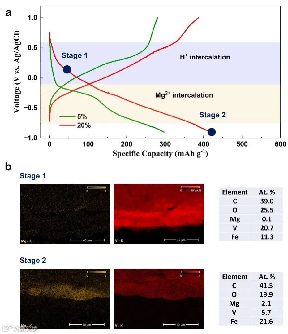图S10展示了在5% H2O电解液中,放电平台约为-0.25 V(vs. Ag/AgCl)对应于Mg2+的插层/脱嵌,而放电平台约为0.26 V(vs. Ag/AgCl)对应于H+的插层/脱嵌。EDS 映射用于直接可视化镁离子在 20% H₂O 电解液中不同放电深度插入V2O5电极(横截面视图),如图 S10b 所示。在第1阶段,对应于放电至 0.26 V(相对于 Ag/AgCl),EDS 显示 Mg 元素几乎不存在,这表明在这个阶段几乎没有镁离子的插层。然而,当在第2阶段完全放电至 -0.9 V(相对于 Ag/AgCl)时,在整个横截面中检测到镁离子,表明镁离子在 V2O5电极中完全嵌入。