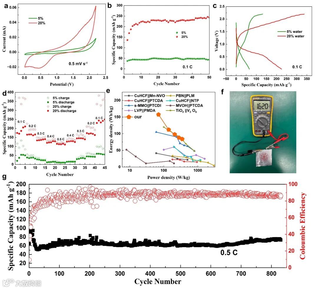 图5g展示了在20%水含量电解液中,V2O5||PTCDI全电池在0.5 C倍率下的长循环性能。电池在经过800次循环后仍能保持78.2 mAh/g的放电容量,表明电池具有良好的循环稳定性。