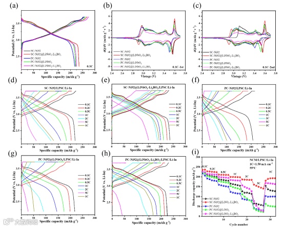 图3. (a)SC-Ni92、SC-Ni92@LiNbO3-Li3BO3、PC-Ni92、PC-Ni92@LiNbO3和PC-Ni92@LiNbO3-Li3BO3在SASSBs中0.1 C时的充放电曲线。(b-c)SC-Ni92、SC-Ni92@LiNbO3-Li3BO3、PC-Ni92、PC-Ni92@LiNbO3和PC-Ni92@LiNbO3-Li3BO3的dQ/dV曲线。(d-h)SC-Ni92、SC-Ni92@LiNbO3-Li3BO3、PC-Ni92、PC-Ni92@LiNbO3和PC-Ni92@LiNbO3-Li3BO3在SASSBs中不同倍率下的充放电曲线。(i)SC-Ni92、SC-Ni92@LiNbO3-Li3BO3、PC-Ni92、PC-Ni92@LiNbO3和PC-Ni92@LiNbO3-Li3BO3在SASSBs中的倍率性能。