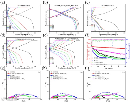图4. (a-e)SC-Ni92、SC-Ni92@LiNbO3-Li3BO3、PC-Ni92、PC-Ni92@LiNbO3和PC-Ni92@LiNbO3-Li3BO3在SASSBs中不同循环次数的充放电曲线。(f)SC-Ni92、SC-Ni92@LiNbO3-Li3BO3、PC-Ni92、PC-Ni92@LiNbO3和PC-Ni92@LiNbO3-Li3BO3在SASSBs中1 C时的长循环性能。(g-i)SC-Ni92、SC-Ni92@LiNbO3-Li3BO3、PC-Ni92、PC-Ni92@LiNbO3和PC-Ni92@LiNbO3-Li3BO3在SASSBs中不同循环次数的Nyquist图。
