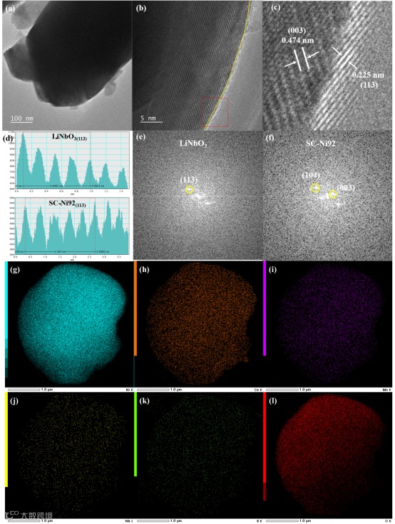 图2. (a)SC-Ni92@LiNbO3-Li3BO3颗粒的TEM图像。(b-d)SC-Ni92@LiNbO3-Li3BO3表面区域的HRTEM图像。(e,f)SC-Ni92@LiNbO3-Li3BO3的衍射图。(g-l)SC-Ni92@LiNbO3-Li3BO3颗粒的EDS映射。