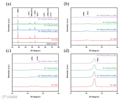 图1. (a)原始SC-Ni92、SC-Ni92@LiNbO3-Li3BO3、PC-Ni92、PC-Ni92@LiNbO3和PC-Ni92@LiNbO3-Li3BO3的XRD图谱。(b-d)图1中三个区域的放大图像。