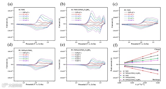 图5. (a-e)SC-Ni92、SC-Ni92@LiNbO3-Li3BO3、PC-Ni92、PC-Ni92@LiNbO3和PC-Ni92@LiNbO3-Li3BO3在硫化物ASSBs中不同扫描速率下的CV曲线。(f)CV中峰值电流(ip)与扫描速率(v1/2)平方根的关系。