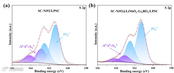 图6. SC-Ni92/LPSC/Li-In电池中原始SC-Ni92正极和SC-Ni92@LiNbO3-Li3BO3/LPSC/Li-In电池中SC-Ni92@LiNbO3-Li3BO3正极在10圈循环后的S 2p XPS谱。