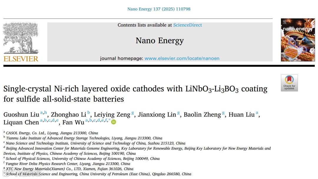 该成果以“Single-crystal Ni-rich Layered Oxide Cathodes with LiNbO3-Li3BO3Coating for Sulfide All-Solid-State Batteries”为题发表在Nano Energy上,通讯作者为中国科学院物理研究所博士生导师吴凡,第一作者为中国石油大学(华东)硕士研究生刘国顺。