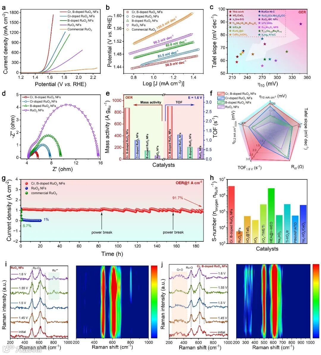 图3 Cr,B共掺杂RuO2纳米纤维的酸性析氧性能研究。