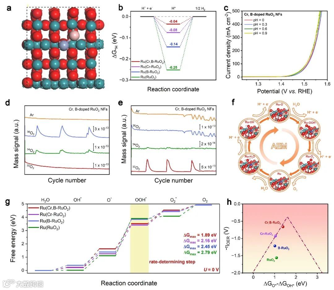 Cr,B共掺杂RuO2纳米纤维的密度泛函理论计算表明,Cr,B共掺杂RuO2体系中Ru–B–Cr结构的Ru位点对*H的吸附能相较于其他对比样来说明显更接近于0 eV,证实Cr,B共掺杂RuO2纳米纤维优异的析氢活性。此外,差分电化学质谱以及pH依赖性测试表明,Cr,B共掺杂RuO2纳米纤维遵循吸附质演化机理(AEM),并且其Ru位点展现出对*OOH更低的吸附能垒,证明由桥连B构筑的Ru–B–Cr结构显著提高了Ru位点的析氧活性。