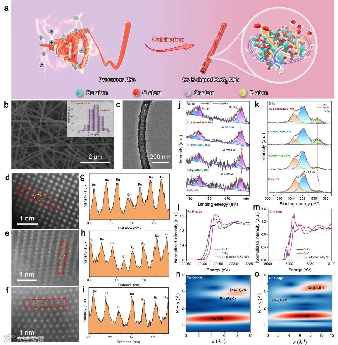 利用静电纺丝技术,实现了将Cr与B原子的成功掺入到RuO2晶格中。实现了非对称结构单元Ru–B–Cr的构筑。SEM,TEM,AC-STEM,XPS,XAS等表征证实Cr,B共掺杂RuO2纳米纤维的形成。