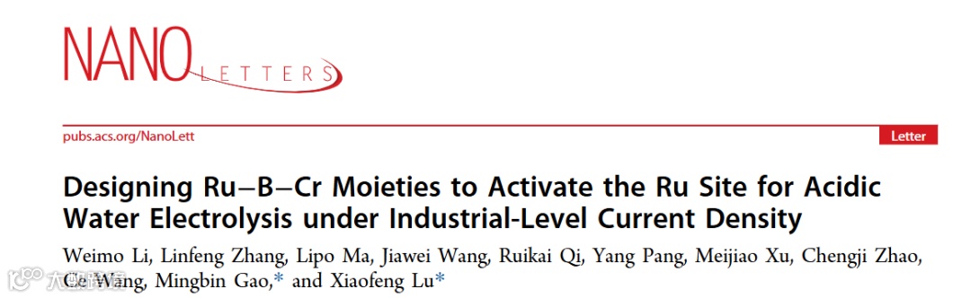 基于此,来自吉林大学的卢晓峰教授与厦门大学的高铭滨副教授合作,在国际知名期刊Nano Letters上发表题为“Designing Ru−B−Cr Moieties to Activate the Ru Site for Acidic Water Electrolysis under Industrial-Level Current Density”的研究论文。该研究通过静电纺丝技术向RuO2纳米纤维中掺入Cr和B原子,形成高活性的Ru−B−Cr结构单元,不仅激活了Ru位点的活性,并且显著抑制了Ru的过氧化现象,最终展现出优异的酸性双功能电催化活性及稳定性。