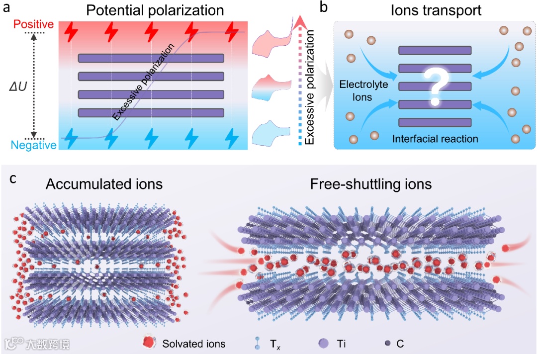 Ti3C2Tx-MXene作为储能领域研究最广泛的MXene之一,其电化学活性主要在负电位区间。当提高正电位,循环伏安(CV)曲线表现出过度极化现象, MXene电极则逐渐氧化失效。根据电化学反应机制,MXene参与电化学反应主要依赖于与电解质离子的界面相互作用。在电极-电解质界面,电解质离子经过吸附、脱溶剂、跨双电层扩散等一系列复杂的过程,才能参与MXene的表面的电化学反应。电化学反应过程的效率取决于表面电荷分布、MXene的比表面积和电解质的性质。因此,研究电解质离子的传输机制对于理解MXene正电位提升的局限性至关重要。这不仅涉及离子在电解液中的扩散,还涉及电解质离子与 MXene 表面相互作用的界面区域的迁移。然而,界面电化学过程及其对电化学电势窗和极化的影响仍然知之甚少。