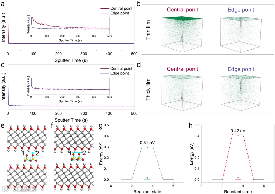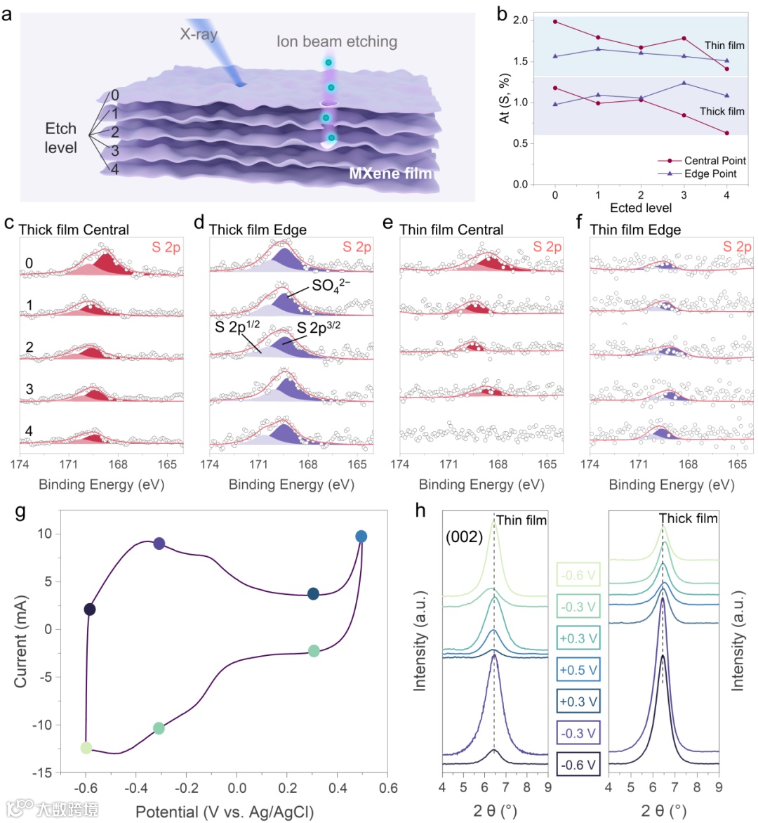 借助XPS深度刻蚀分析,对高压极化后薄电极和厚电极中电解质离子示踪。证明薄厚电极在发生高压极化后离子扩散的差异,在薄电极中电解质离子能够进入MXene层间参与电化学反应,而厚电极中仅有极少部分的电解质离子进入MXene层间。