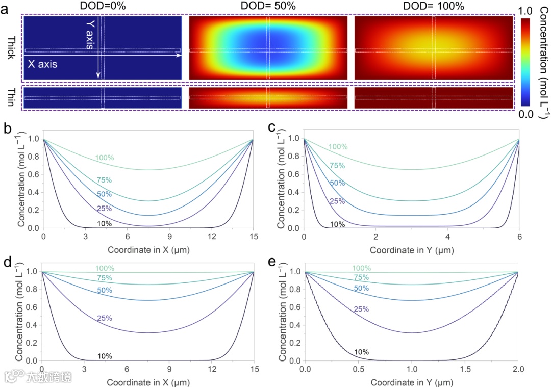 分别建立厚电极和薄电极模型,采用FEA模拟将离子在电极中的扩散可视化。其中厚电极和薄电极显示明显差异。当放电深度(DoD)从0到100%的过程中,薄电极完成彻底的离子扩散,进入MXene层间,而厚电极仅有部分离子扩散进入MXene层间,大部分积聚在电极边缘。