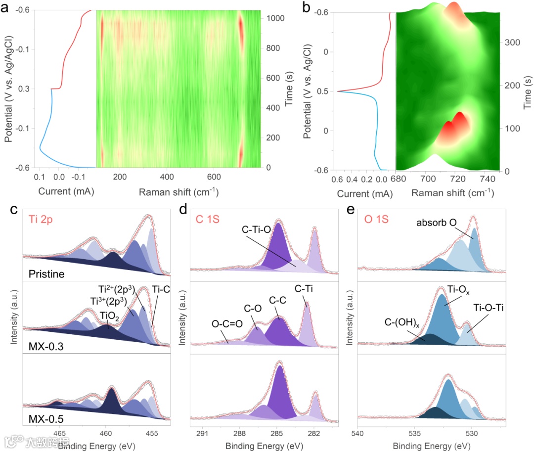 原位拉曼监测MXene在电化学反应过程中电极材料结构的变化,结果表明在常规的电压区间和产生极化的扩大的电压区间进行电化学循环,MXene仍能保持可逆的结构变化。但非原位XPS结果表明,产生极化的扩大的电压区间电化学循环后,MXene电极明显被氧化。而常规电压区间电化学循环的MXene电极结构保持完整。