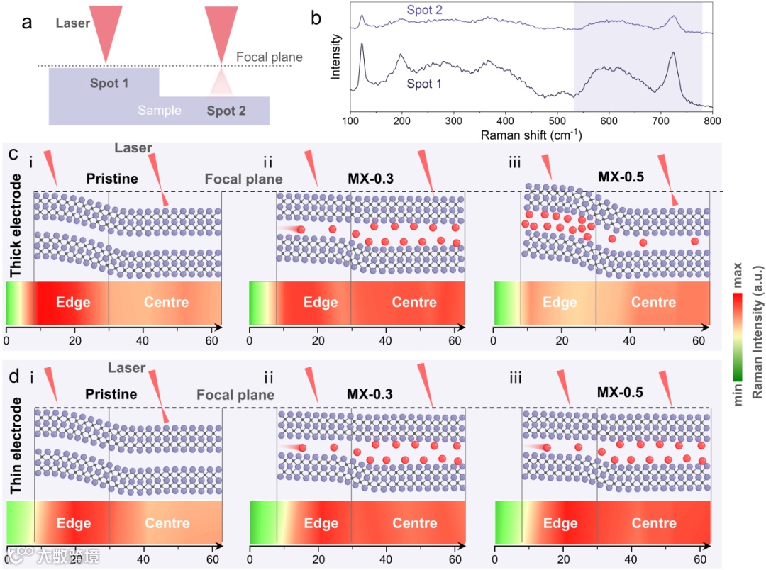 进一步利用拉曼mapping对电极空间垂直位移监控的方法,验证薄厚电极在高压极化下电解质离子的扩散机制。结果表明在薄电极中电解质离子扩散进入MXene层间,而在厚电极中仅有极少部分电解质离子进入MXene层间。