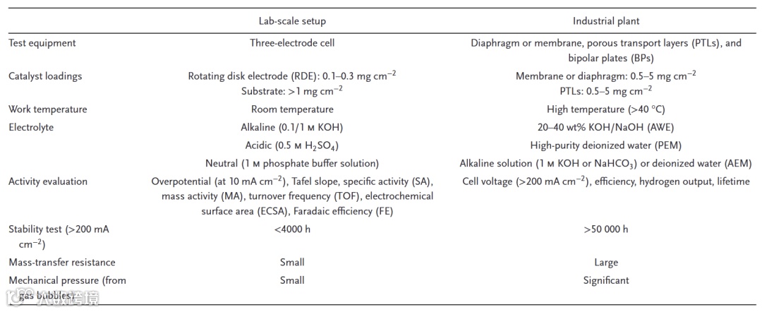 表 1. 实验室和工业水电解槽的参数对比。