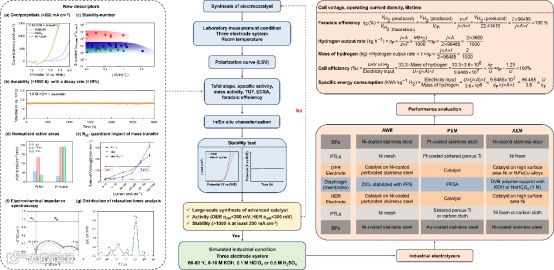 本文提出了一套简化的从实验室设计到工业应用的催化剂逐步评估流程,重点关注催化剂大规模合成可行性及在高电流密度下的低过电位和良好耐久性。考虑工业环境中的条件(高温、高浓度电解液、高压以及电解液的快速流动)会对催化剂的本征反应动力学和物质传递产生影响,构建结构-性能关系非常重要但极具挑战。建议在膜电极组件配置的电解槽中,通过快速启停测试来有效评估催化剂在波动可再生能源供电条件下的表现。