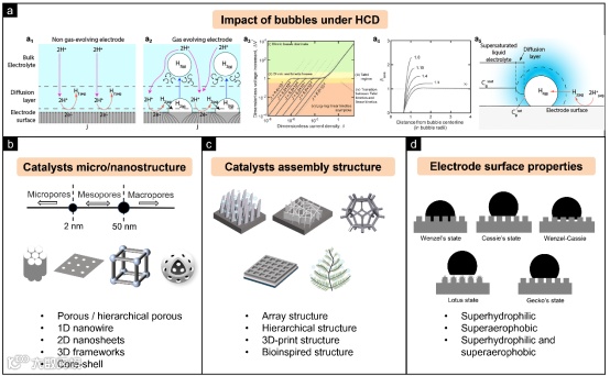 图 6. a1) 单相中可能的气泡变化过程和 a2) 影响 H2 析出电极电位损失的气体放出系统。a3) 附着气泡对电位增加 a4) 和电极电流分布的影响。a5) 不断增长的气泡周围气态产物的浓度分布。b–d) 增强高电流密度下催化剂传质的相应策略。