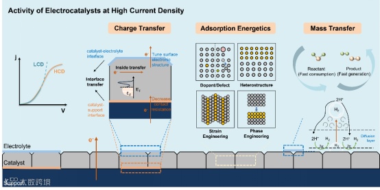 图 4. 电荷转移、吸附能和物质转移对高电流密度水电解中催化剂活性的影响。左侧部分显示了催化剂内部和表面,以及催化剂-电解质和催化剂-载体界面的电荷传输过程。中间部分总结了调控吸附能的代表性催化剂工程策略,包括掺杂/缺陷、异质结构、应变工程和相工程。最右侧部分说明了高电流密度水电解过程中的物质转移过程,显示了可能导致析氢电极活性损失的质量传输和对流过程。