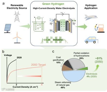 图1. a) 示意图描绘了通过弥合实验室研究成果与实际工业应用的差距,高电流密度下的电解水技术在绿色氢气生产中所发挥的关键作用。b) 2020 年和 2050 年电解水电流密度的比较。c) 各种氢气生产技术的比例分布。