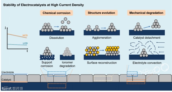 图 5. 示意图显示了高电流密度条件下典型的催化剂降解路径,包括化学腐蚀(溶解、载体腐蚀和离子聚合物降解)、结构演变(团聚和表面构造)和机械降解(催化剂脱落和电解质对流)。