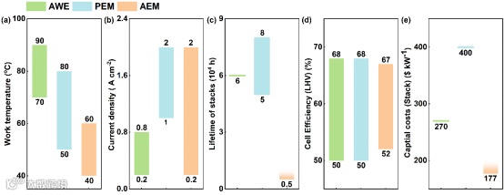 图 2. 三种商用电解槽参数比较:a) 工作温度、b) 电流密度、c) 电池组寿命、d) 电池效率(低热值,LHV)和 e) 电池组的资本成本。
