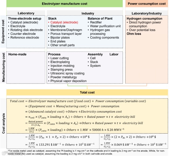 通过分析实验室和工业水电解系统间的差距,对比了催化剂在两种条件下的配置和性能评估的差异,特别关注了市场中主流低温(<100°C)水电解槽的评估参数。此外,对商业电解槽进行了成本分析,并强调了催化剂对电解槽成本的显著影响。