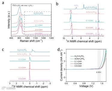 传统水系酸性电解液存在副反应问题,而以CTAB为构筑单元的非水分子胶束聚集体电解液(CAH)通过增强氢键网络和优化微环境,提高了质子传导效率和体系稳定性。拉曼、FT-IR和NMR等表征结果表明,CTAB的加入促进了H₃PO₄分子与ACN和水之间的相互作用,并显著增强了氢键网络的强度与方向性。理论计算显示,CTAB与H₃PO₄间较强的静电作用有助于形成稳定的胶束结构,优化质子传输路径。