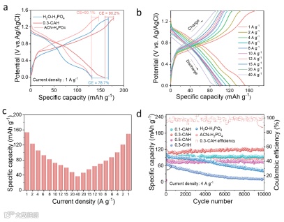 在0.3-CAH电解液中,H-VHCF正极表现出优异的电化学性能,放电容量达158.6 mAh g⁻¹,库仑效率提高至90.2%,且高倍率下容量保持良好,循环稳定性显著优于传统电解液。这得益于ACN的弱极性减少了析氧反应,以及非扩散型Grotthuss质子传导机制的补偿效应。经过10000次循环后,容量仍保持118 mAh g⁻¹,优于大多数已报道的质子存储材料。