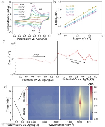 研究表明,0.3-CAH电解液与H-VHCF阴极的质子存储以Grotthuss机制为主,展现快速动力学特性。CV测试表明电容贡献占主导,且随扫描速率增加而提升。GITT分析显示H⁺扩散系数在10⁻⁹至10⁻¹²范围内。原位FT-IR和非原位XPS揭示充放电过程中的钒和铁氧化态变化具有良好可逆性。