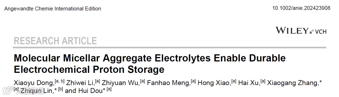 基于此,来自新加坡国立大学的林志群教授与南京航空航天大学的窦辉、张校刚教授合作,在国际知名期刊Angew. Chem. Int. Ed. 上发表题为 “Molecular Micellar Aggregate Electrolytes Enable Durable Electrochemical Proton Storage”的研究性文章。该文章提出利用分子胶束聚集体电解质解决酸性水系电解质中水分解问题,实现了高稳定性、高能量密度和宽电压窗口的质子电池设计。