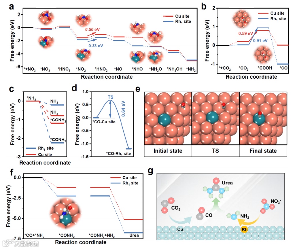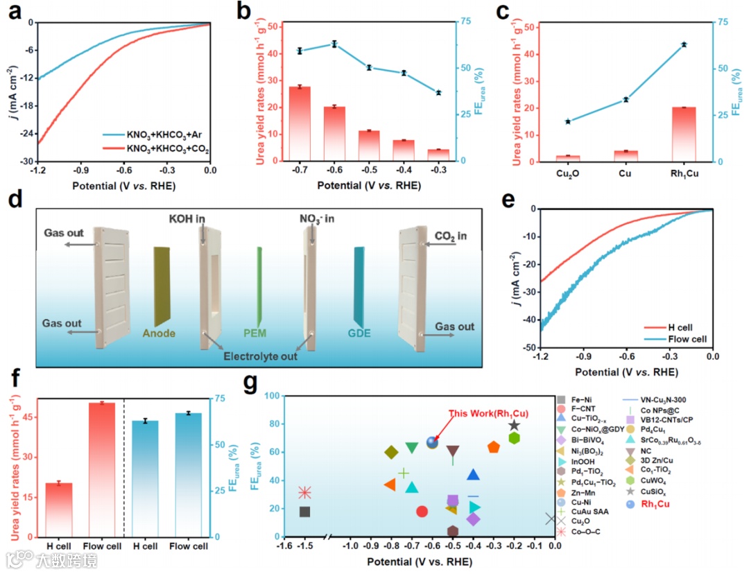近日,来自兰州交通大学的褚克教授团队在《ACS Nano》上发表了题为“Relay Catalysis of Isolated Rhodium-Alloyed Copper Boosts Urea Electrosynthesis from Nitrate and CO2”的研究文章。文章证明了 Rh1 单原子被锚定 Cu 基底中可以作为一种高效稳定的 UENC 催化剂。结合原位光谱分析和理论计算揭示了 Rh1位点和 Cu 位点的接力催化作用,其中 Rh1位点激活 NO3− 形成 *NH2,而 Cu 位点激活 CO2 形成 *CO 。形成的 *CO 然后从 Cu 基底迁移到临近的 Rh1位点,这促进了 *NH2和 *CO 的 C-N 偶联而形成尿素。Rh1Cu 在流动池中表现出优异的 UENC 性能,在 -0.6 V 下尿素产率达到了 50.36 mmol h−1 g−1,尿素法拉第效率达到了67.10%,优于绝大部分报道的UENC 催化剂