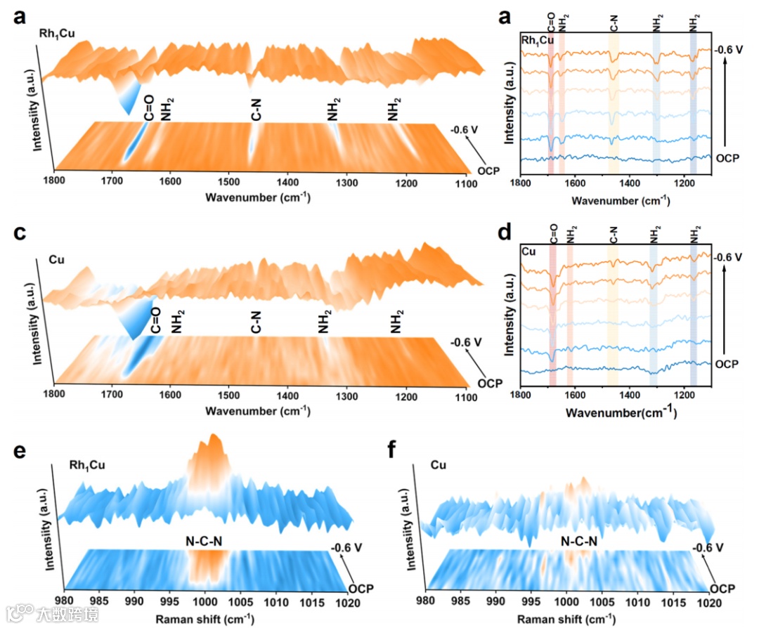 图4. Rh1Cu的UENC性能的原位红外光谱以及原位拉曼光谱表征
