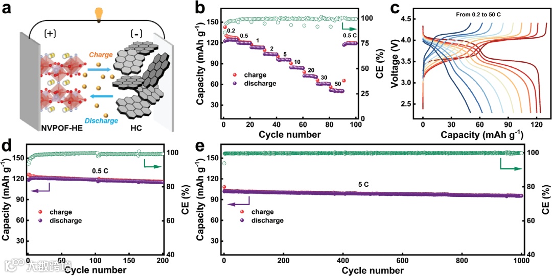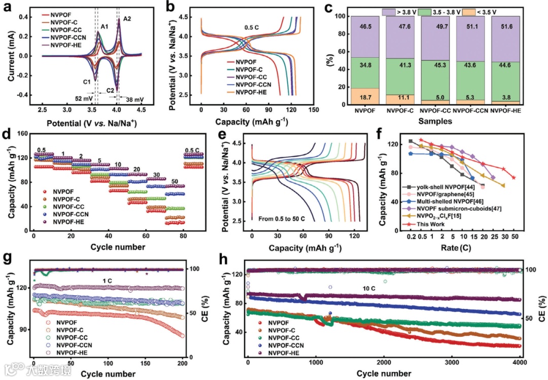 为了进一步评估 NVPOF-HE的实际适用性,将商业硬碳(HC)作为阳极,组装成HC//NVPOF-HE全电池。NVPOF-HE全电池可以在0.2 C下提供463 Wh kg−1的惊人能量密度。即使当速率提高到50 C时,能量密度仍然可以达到169 Wh kg−1。该器件在0.5 C与5 C循环后分别为115.3mAhg⁻¹和95.5mAhg⁻¹,表现出99.4%和99.9%的高库仑效率,具有极好的电化学稳定性和可逆性。这无疑证明了研究制造的可商业化的HC//NVPOF-HE全电池具有优异的长寿命循环稳定性。