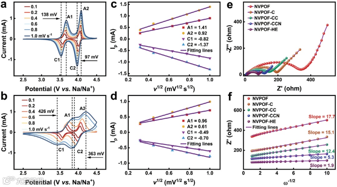 HE掺杂策略通过优化界面电荷转移阻力与Na⁺扩散阻力,有效加速了Na⁺扩散动力学。NVPOF-HE 在CV曲线展现出清晰、尖锐、对称的两组氧化还原峰,氧化还原峰间隙小,表明其具有快速的Na+扩散动力学。循环后的EIS数据显示,NVPOF-HE的Rct值最低,根据低频区Z’与ω⁻½的线性关系,再次证明HE掺杂对Na⁺反应动力学的显著促进作用。