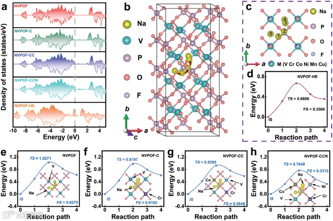对比未掺杂与掺杂后的NVPOF,观察到NVPOF-C、NVPOF-CC、NVPOF-CCN和NVPOF-HE的带隙显著减少,尤以NVPOF-HE最为明显。无论是在原生NVPOF还是掺杂后,Na+的迁移路径保持一致。NVPOF-HE中Na+的迁移势垒降至最低,仅为0.6686eV,相比NVPOF的1.0271eV大幅降低。特别是在NVPOF-HE体系中,减少了约35%。结果表明,HE掺杂不仅减小了NVPOF中Na+的迁移势垒,同时缩减了带隙,极大改善了材料的电子导电性和反应动力学属性,从而提升了其储钠性能。