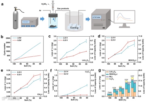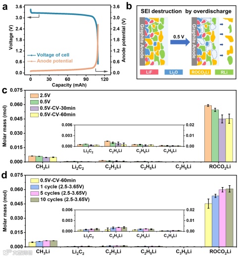 图2. 基于质谱滴定技术量化分析过放电应力下SEI的破坏和正常循环下的修复过程。