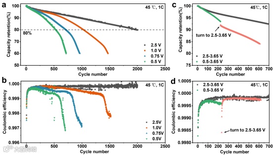 图1. 石墨/LiFePO4软包电池在 2.5 V 正常老化和不同程度过放电老化下的电化学性能。