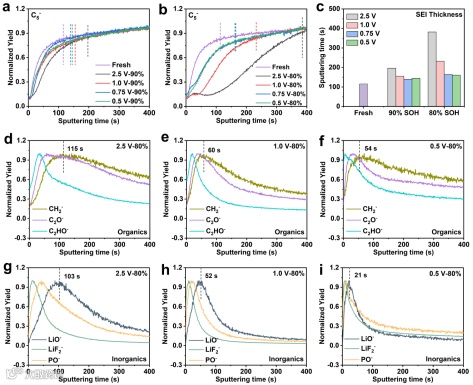 图4. 通过TOF-SIMS分析过放电应力下SEI的厚度和结构演变。