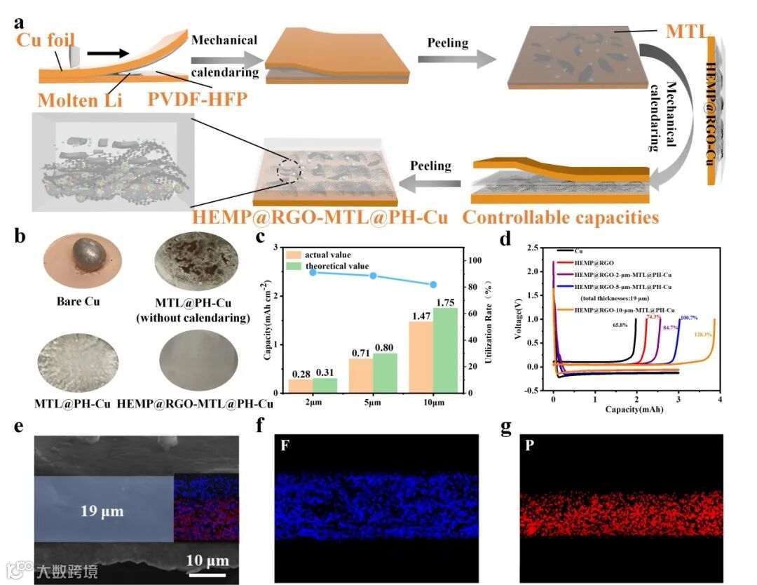 图3. (a) HEMP@RGO-MTL@PH-Cu制备过程示意图。 (b) Bare Cu、MTL@PH-Cu(未压延)、MTL@PH-Cu和HEMP@RGO-MTL@PH-Cu基底的光学图像。 (c) 不同厚度MTL@PH层的理论容量及实际脱锂值。 (d) Bare Cu、不同厚度MTL@PH涂层的HEMP@RGO-Cu的ICE。 (e) HEMP@RGO-MTL@PH-Cu电极的横截面SEM图像及对应的能量色散X射线光谱(EDX)元素分布图。 (f, g) HEMP@RGO-MTL@PH-Cu电极的EDS(F和P)元素分布图。