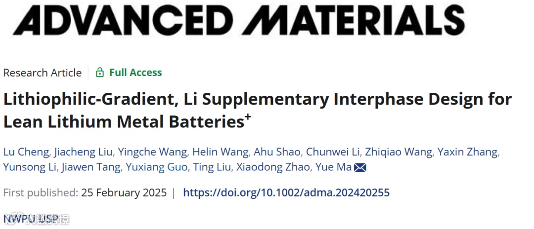近日,来自西北工业大学的马越教授,在国际知名期刊Advanced Materials上发表题为“Lithiophilic-Gradient, Li+ Supplementary Interphase Design for Lean Lithium Metal Batteries”的文章。该文章提出了一种针对少锂金属电池(LLMB)模型的梯度亲锂、离子补偿的层叠界面设计。通过简便的湿化学方法,将具有可定制组分的高熵金属磷化物(HEMP)颗粒分散于还原氧化石墨烯(RGO)中。此外,通过层转移印刷技术,将聚偏二氟乙烯-六氟丙烯(PVDF-HFP)聚合物与熔融锂的混合作为顶部锂补充层(MTL@PH)。这种集成层(HEMP@RGO-MTL@PH)不仅能够实现10 mAh cm⁻²的无枝晶的锂沉积,其对称电池还能在83%放电深度(DOD)稳定循环600 h。当其与高镍三元正极(LiNi₀.₈Mn₀.₁Co₀.₁O₂,NCM811,双面涂覆,16.9 mg cm⁻²,N/P比为0.21)配对组装成200 mAh软包电池时,该电池实现了414.7 Wh kg⁻¹的能量密度、977.1 W kg⁻¹的功率输出,并且通过透射模式原位XRD监测了NCM811的可逆晶格膨胀,揭示了预锂化对Li+利用率的提升机制。本文第一作者为材料学院纳米能源材料研究中心硕士研究生程路,通讯作者为马越教授,通讯单位为西北工业大学。