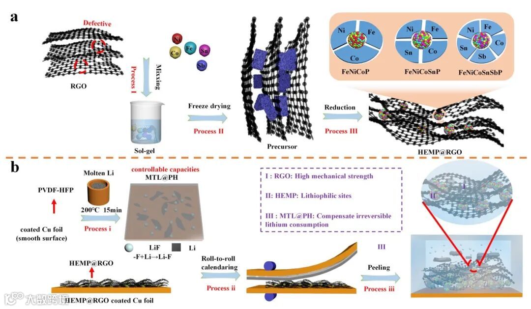 图1. (a) HEMP@RGO制备工艺图:工艺Ⅰ:溶胶-凝胶溶液形成混合物;工艺Ⅱ:通过冷冻干燥法干燥;工艺Ⅲ:煅烧还原。(b)堆叠界面制备工艺图:工艺ⅰ:预锂化层制备;工艺ⅱ:转印法工艺;工艺ⅲ:分离形成HEMP@RGO-MTL@PH-Cu。