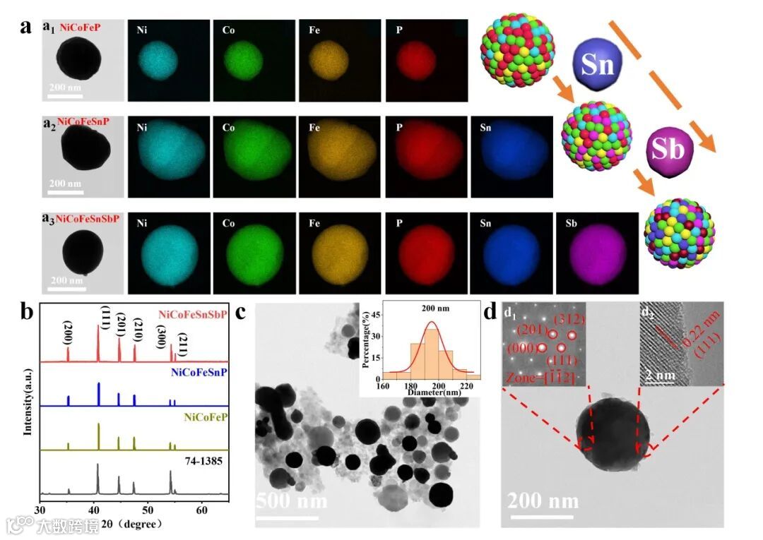 图2. (a) 不同组成的HEMP颗粒(包括NiCoFeP、NiCoFeSnP和NiCoFeSnSbP)的透射电子显微镜(TEM)图像及对应的元素分布图。 (b) NiCoFeP、NiCoFeSnP和NiCoFeSnSbP颗粒的X射线衍射(XRD)图谱。 (c) NiCoFeSnSbP颗粒的TEM图像及粒径分布(插图)。 (d) NiCoFeSnSbP颗粒的TEM图像(插图d1:NiCoFeSnSbP颗粒的选区电子衍射(SAED)图案;插图d2:颗粒边缘的高分辨率TEM图像)。