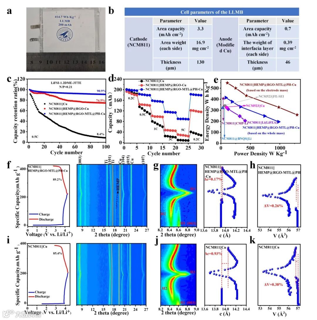 图4. (a) 200 mAh LLMB软包电池的光学图像。(b) 200 mAh软包电池的技术规格。(c) NCM811||Cu,NCM811||HEMP@RGO-Cu和NCM811||HEMP@RGO-MTL@PH-Cu的循环性能。(d)倍率性能。(e) 本研究中不同功率输出下的能量密度与先前研究的性能指标的比较。(f、 i)NCM811||HEMP@RGO-MTL@PH-Cu和NCM811||Cu的充放电曲线。(g,j)NCM811中(003)衍射峰的相变和晶格变化。(h、 k)晶胞体积变化图。