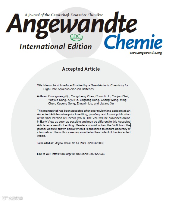 近日,山东大学徐立强教授团队在国际知名期刊Angew. Chem. Int. Ed上发表题为“Hierarchical Interface Enabled by a Guest-Anionic Chemistry for High-Rate Aqueous Zinc-ion Batteries”的研究文章。该研究将一种含有强极性、亲Zn客体阴离子的共溶质acesulfame potassium (ACES-K),引入到传统的低浓度水系电解质中。这种调控提高了电解质的离子电导率,并加速了Zn2+在电极/电解质界面的去溶剂化过程。此外,引入的ACES阴离子促使形成具有分级晶态-非晶态双层结构的稳定固体电解质界面,这有效地抑制了副反应,并使Zn2+能够均匀扩散沉积。显著提高了锌金属负极的可逆性。