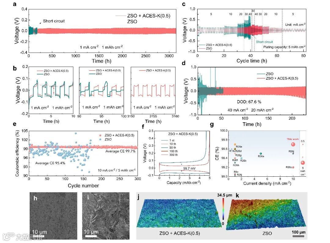 要点三 锌负极在高倍率和高DOD下的优异可逆性:使用定制的ZSO + ACES-K(0.5) 电解质,锌负极在高达50 mA cm−2的高倍率和67.6%的放电深度下表现出显著增强的可逆性。在电流密度为10 mA cm−2的情况下,实现了99.7%的高库伦效率。