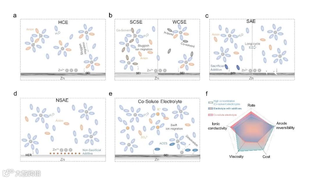 水系锌离子电池(AZIBs)具有成本低、安全性高、环保等固有优势,在电网级储能领域展现出巨大的潜力。然而,锌负极与水系电解质之间的界面兼容性不佳,导致锌枝晶生长和副反应无法控制,阻碍了锌负极的库仑效率和寿命,使得水系锌离子电池难以满足实际应用需求。因此,开发可持续和有效的策略来优化锌负极与电解质之间的界面化学,对于AZIBs的大规模应用至关重要。通过电解质工程实现界面化学调控被视为改善锌负极在水系电解质中可逆性的最有效策略之一。然而常用的共溶质策略往往以牺牲电解质本征离子电导率为代价;而引入痕量添加剂的策略则在持久性保护和副反应抑制方面存在挑战。因此,迫切需要开发一种低成本的水系电解质,在保持其高离子电导率的同时,可以持续性优化和稳定阳极/电解质界面。