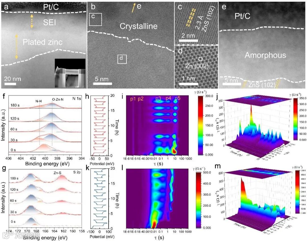 要点二:稳定锌负极的动态-静态分级界面:客体阴离子 (ACES) 在锌阳极表面的特异性吸附有利于IHP的重建,促进锌离子的快速脱溶。此外,ACES能够在锌沉积过程中电化学还原分解原位形成非晶-结晶复合SEI,有效抑制枝晶的形成和界面副反应。