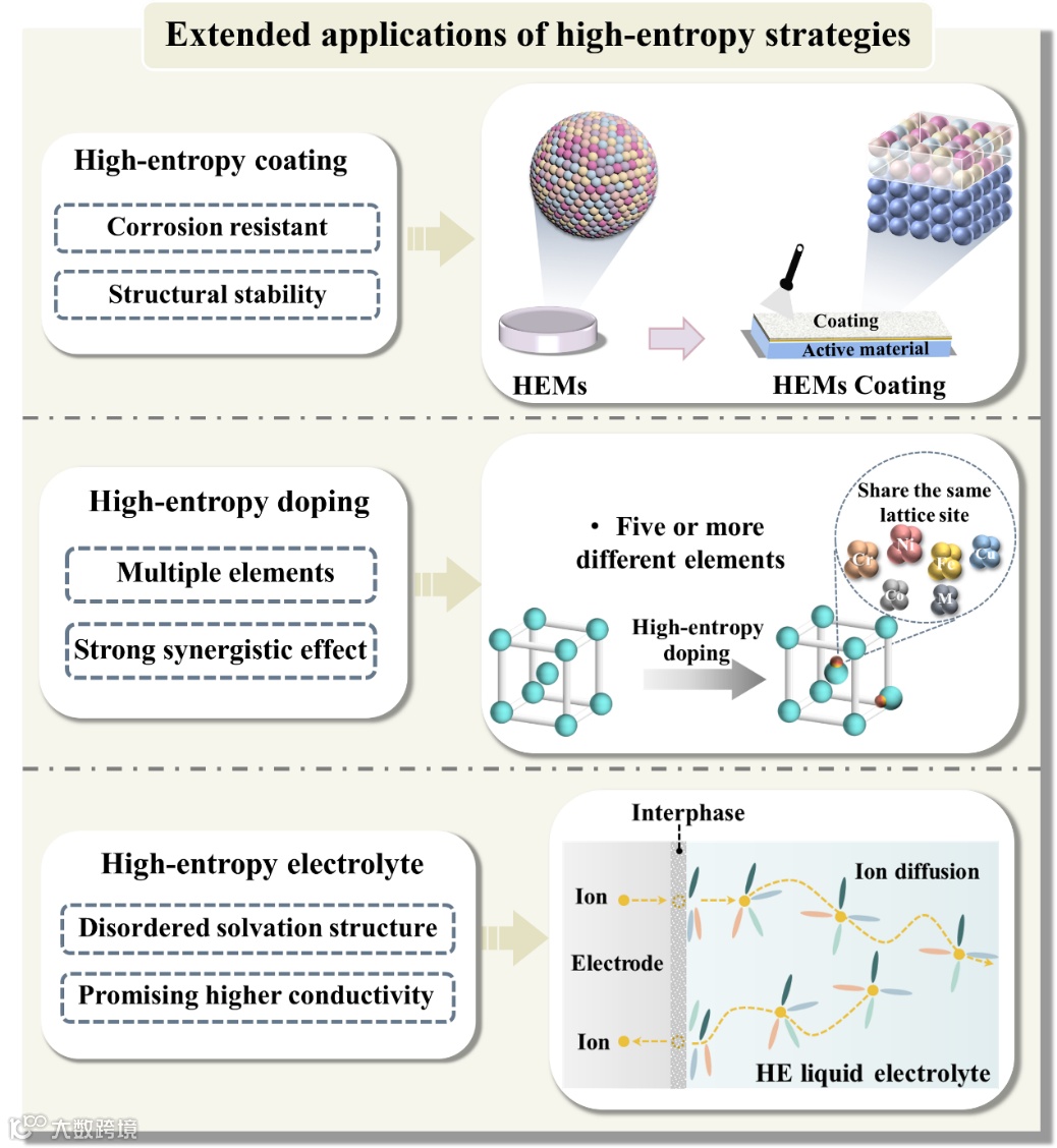 目前HEMs的相关研究工作主要集中在利用高熵策略增强电极材料和改进电解质方面。近来,电池设计领域出现了一些新兴的材料改性策略,例如高熵掺杂、高熵涂层以及高熵液态电解质,文章系统地介绍了这些高熵概念的延伸方法,以拓宽高熵策略的实际应用范围。
